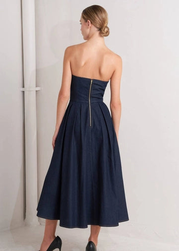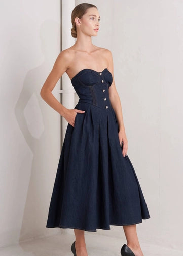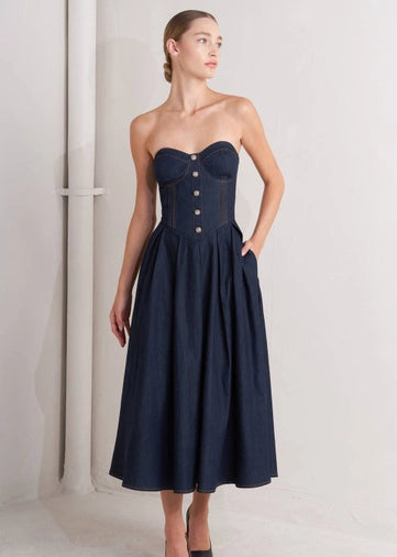 A denim midi dress featuring strapless sweetheart neckline, bustier bodice with button detail, basque waist, full skirt and back zipper closure.