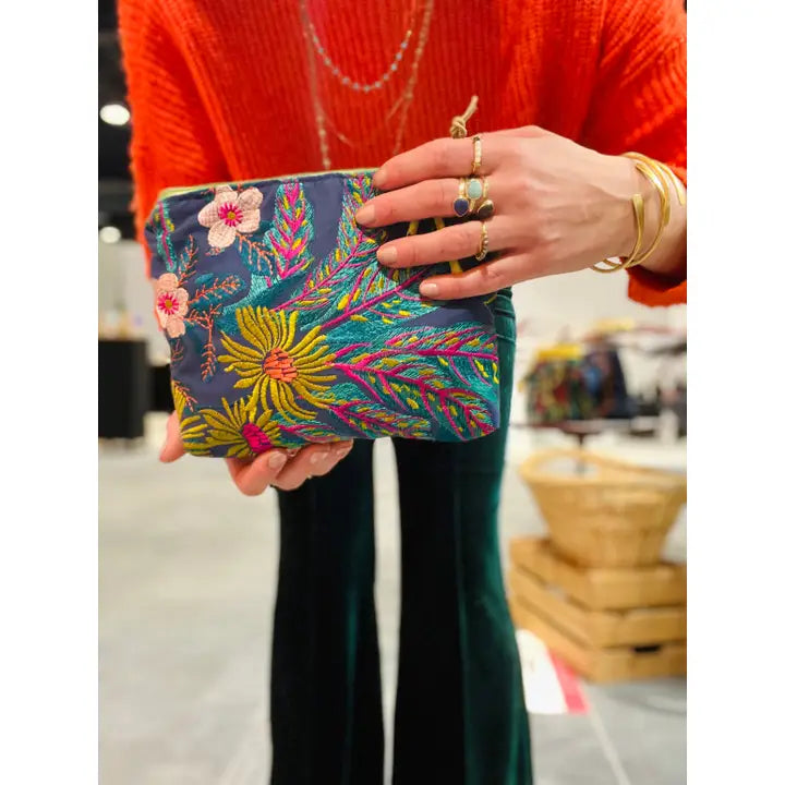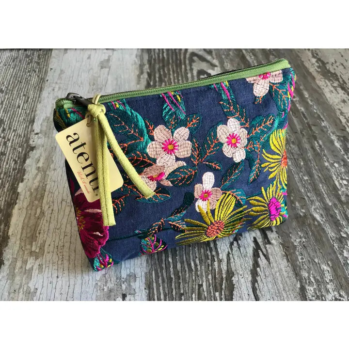 This eye-catching floral pouch is the perfect way to store your trinkets and treasures in style! Our upholstery-grade fabric ensures that this unique piece will stand the test of time. Crafted with a cheeky combination of embroidered florals, denim, and a bright green zipper, it's sure to be the envy of all your friends! Handmade in the U.S.A., the Flora Accessories Pouch is the ideal way to tote your keepsakes around in quirky, colorful fashion. This multi-functional pouch is perfect for neatly stashing makeup, needlearts supplies, charging cords, and more.