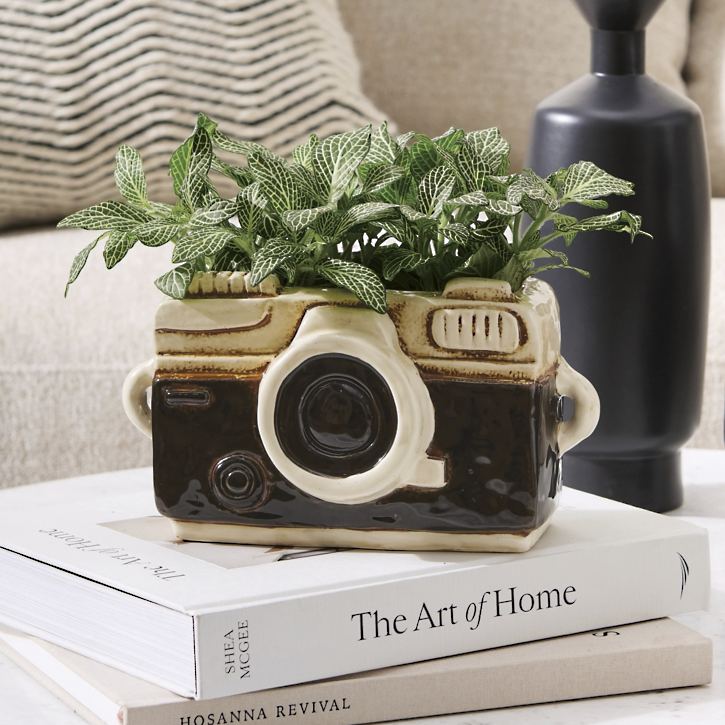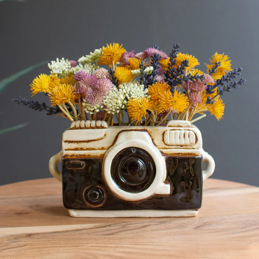 Shutterbugs will love this ceramic camera planter. Use it for pencils, blooms, or other items atop a desk or bookshelf for the perfect shot. This vintage-style black and white camera planter makes a great gift.