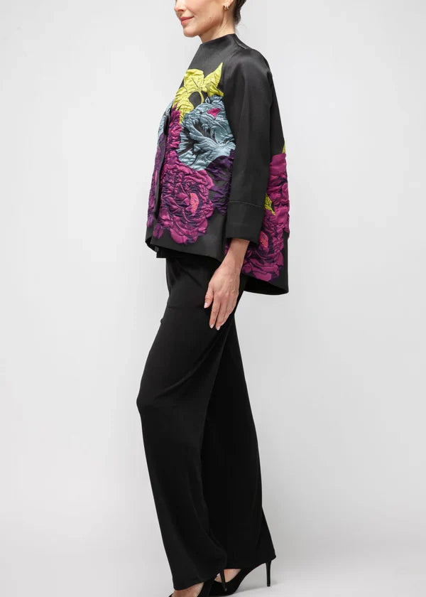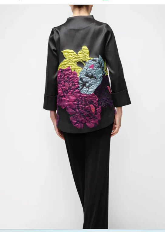 Crafted in a sleek black fabric, this jacket features vibrant, textured floral appliqués in bold shades of yellow, blue, and fuchsia for a truly artistic finish. The asymmetric front closure with oversized button detail adds a modern twist, while the relaxed fit.