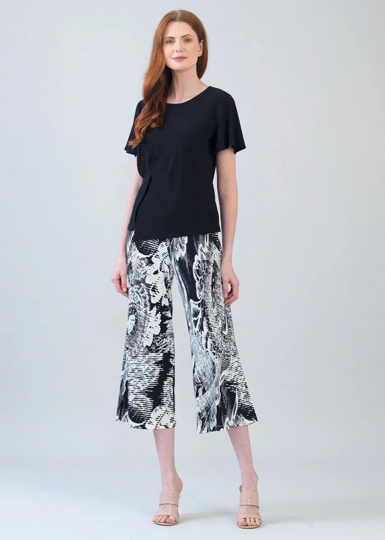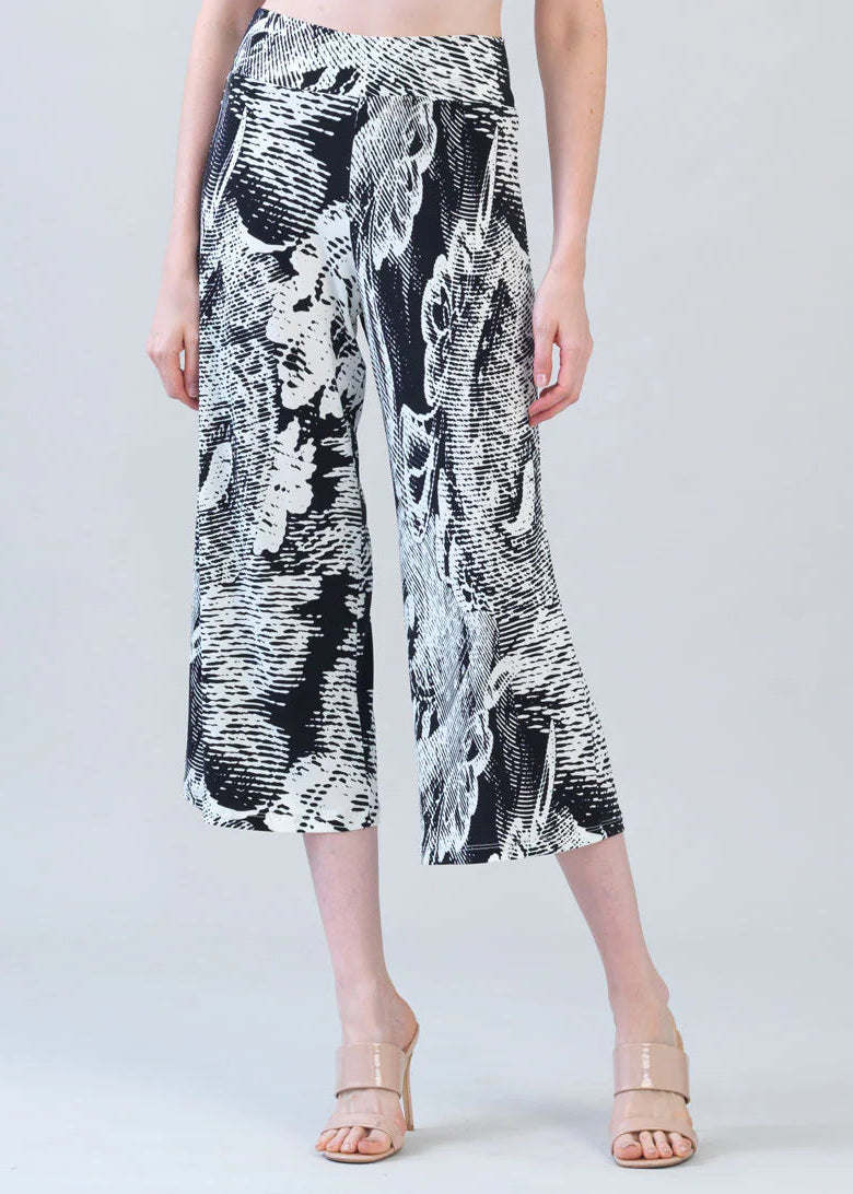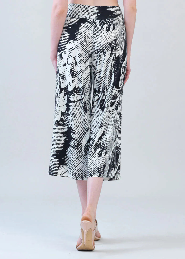 Drawn to stand out! Our Abstract Etch Modern Gaucho Pant is where bold lines meet effortless confidence. Featuring a 3” pull-on soft waistband, flattering wide-leg, calf-length cropped hem, and is designed to flow naturally against the body.