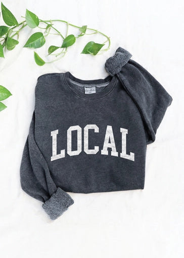 LOCAL Mineral Washed Graphic Sweatshirt Unisex Fleece Pullover Relaxed Fit. -Spun from plush sponge fleece fabric -Remarkably soft unisex pullover -Crewneck sweatshirt lends itself to daily wear and year-round layering. -All items are slightly different because of the dying process of the garment. -Featuring ribbed cuffs and waistband, a crew neck, and fashion-forward fleece fabrication.