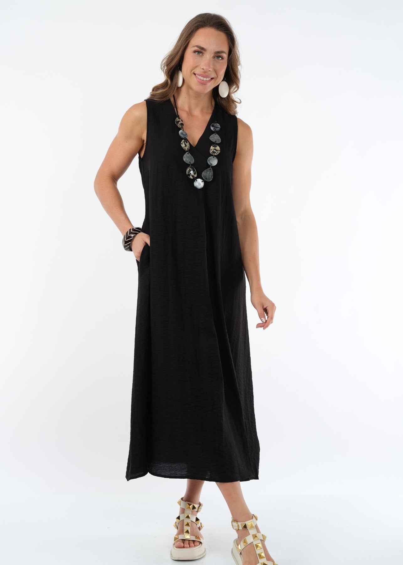 Sleeveless Pleat Front Dress with Gathered Back Detail