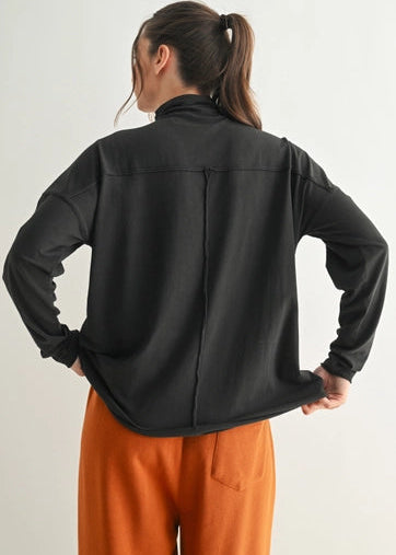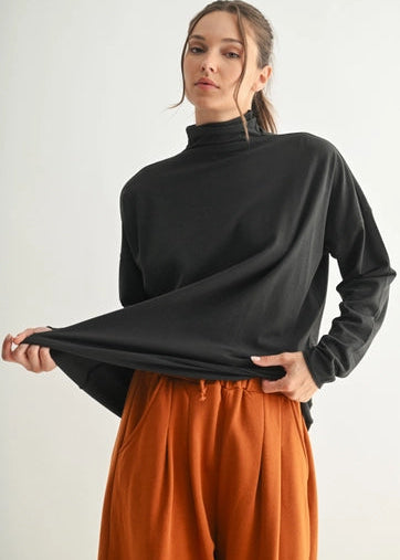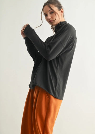 Effortlessly cool and endlessly cozy, the Pima Cotton Slouchy Turtleneck is your go-to for relaxed style. Made from a premium pima cotton blend, it features drop shoulders for a laid-back fit and raw edge details along the neck, wrist cuffs, bottom hem, and back seams for a touch of undone charm. Perfect for layering or wearing solo, this top delivers that lived-in feel with a sophisticated silhouette.