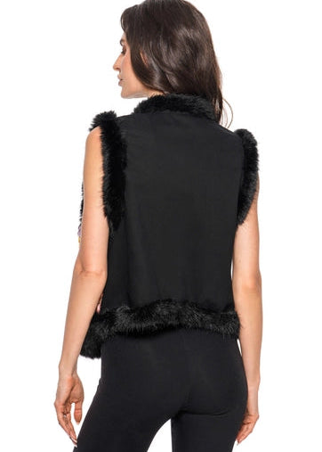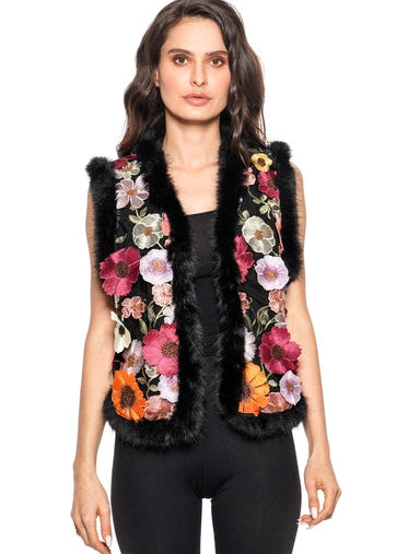 Add a bold and artistic touch to your boutique offerings with our Floral Faux Fur Vest. This sleeveless showstopper is crafted in soft black faux fur and richly adorned with vibrant 3D floral appliqués in a variety of colors. Designed for the fashion-forward woman who embraces unique textures and standout details, this piece delivers eye-catching sophistication with comfort and ease.
