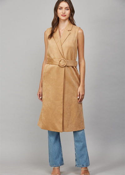 Fuax Suede Long Tailored Vest with Matching Belt with Buckle