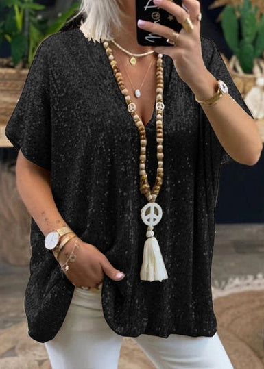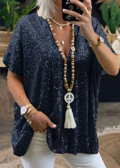 Shimmering sequins elevate street style. Comfy loose fit moves with your day. V neckline flatters.